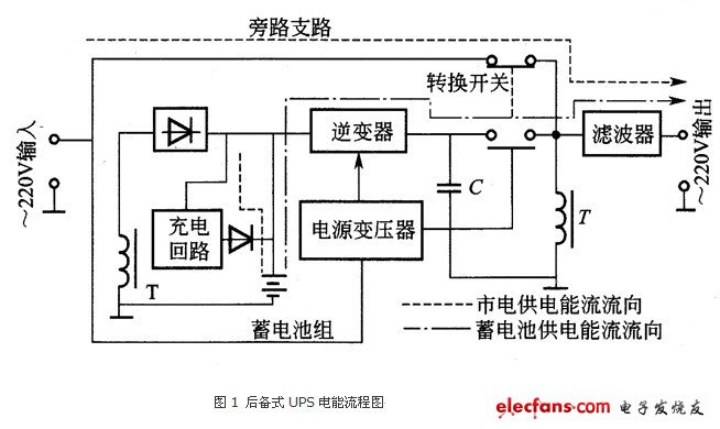 图1为后各式UPS电能流程图。市电供电正常时,市电一方面直接通过交流旁路支路转换开关,经滤波器输出至负载;另一方面通过电源变压器,经整流后变成直流电,再经充电回路向蓄电池组充电。当市电供电中断时,蓄电池储存的电能通过逆变器变成交流电,经滤波器继续向负载供电。在后各式UPS中实际电路也含有各种保护、告警等控制回路,比较复杂。