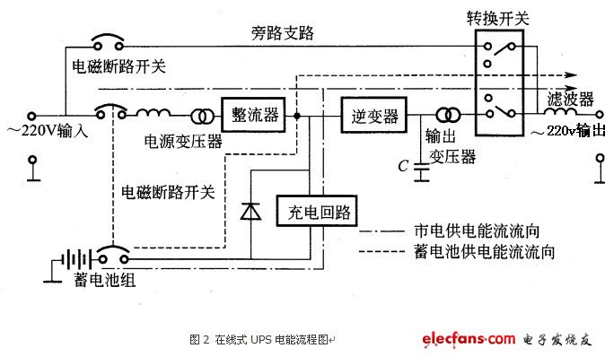 (2)在线式UPS 图2为在线式UPS电能流程图。市电供电正常时,市电经过电源变压器、整流器后,一路经逆变器、滤波器输出至负载;另一路经充电回路向蓄电池组充电。当市电中断,蓄电池组端电压低于设定值或逆变器故障时,市电就通过旁路支路经转换开关、滤波器向负载供电。由此可见,不管市电正常或中断,在线式UPS的逆变器总是在工作。