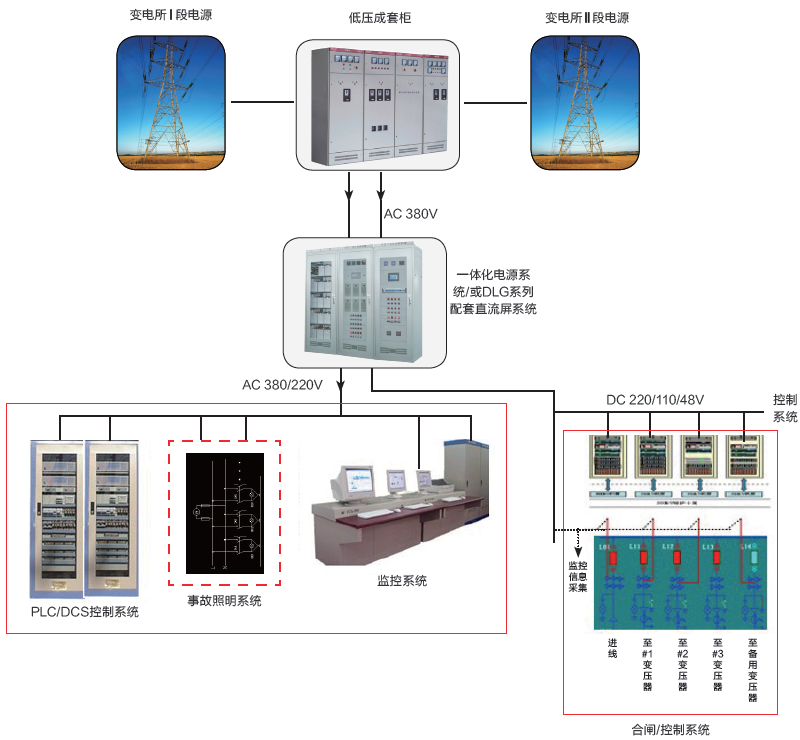 ● 系统简介:主要为变电站的重要负荷,如继电保护装置、控制设备、断路器合闸动力负荷、通信设备、监控、消防等设备提供交流、直流、通信电源保障;